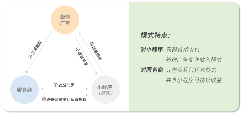 为帮助广大代开发小程序商家进行流量变现,同时让服务商伙伴享受微信生态带来的商业价值。微信广告联合微信开放平台,推出「小程序流量主代运营」模式。通过为服务商(即“小程序代开发服务商”)提供官方产品能力,支持其协助小程序商家进行流量变现,共享广告收益,获得可持续商业化收入补充。