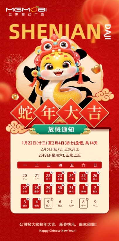 时光荏苒,岁月如梭,回首过去一年,承蒙您对YuLongValue传媒始终如一的信任与鼎力支持,我们深感荣幸与感激。值此2025年新春佳节翩然而至之际,YuLongValue传媒全体员工提前恭祝您及您的家人在新的一年里,吉祥如意,幸福安康,蛇年行大运,万事皆顺遂!现将2025年春节假期安排敬告如下: